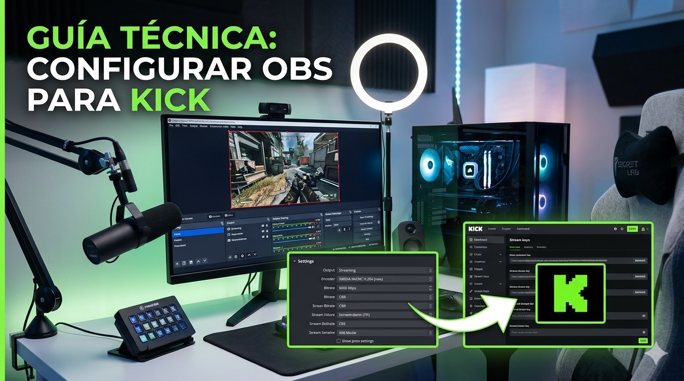 La configuración de OBS para Kick consiste en vincular la clave de transmisión (Stream Key) del panel de creador de Kick con el software de codificación, ajustando el codificador de video (preferentemente hardware como NVIDIA NVENC) a un bitrate recomendado de entre 6,000 y 8,000 kbps para asegurar una emisión estable en alta definición.